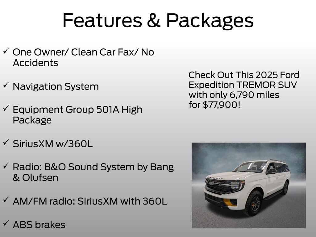 Experience the pinnacle of capability, comfort, and technology with this exceptional 2025 Ford Expedition Tremor. We invite you to visit our showroom and take this remarkable SUV for a test drive. Prepare to be captivated by its unparalleled performance, refined interior, and cutting-edge features. Let us help you unlock the true potential of your driving experience.