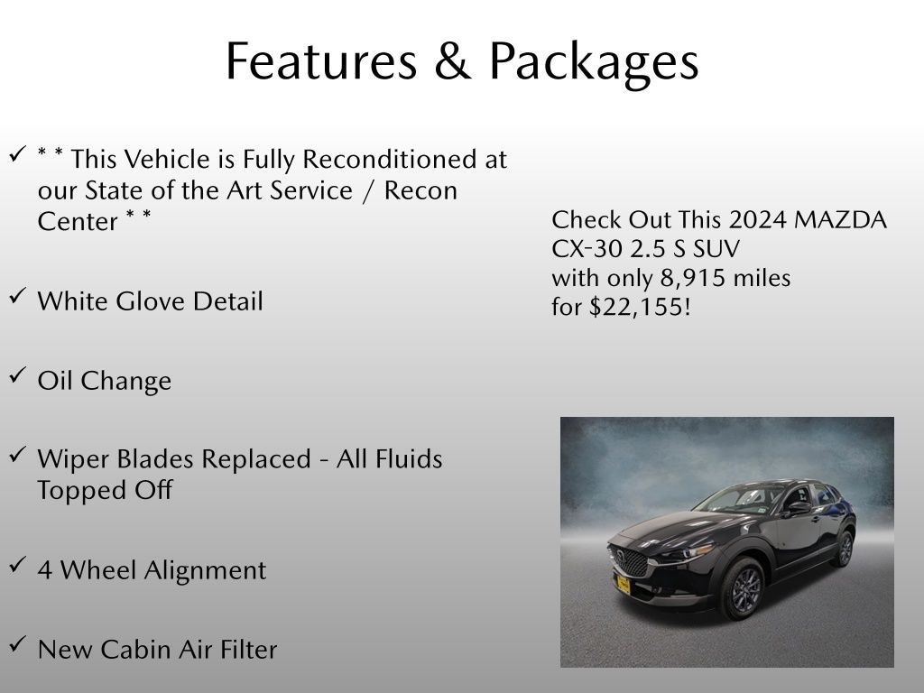 Elevate your driving experience with the remarkable 2024 Mazda CX-30 2.5 S. This meticulously reconditioned SUV combines style, performance, and advanced technology to deliver a driving experience that will captivate your senses.